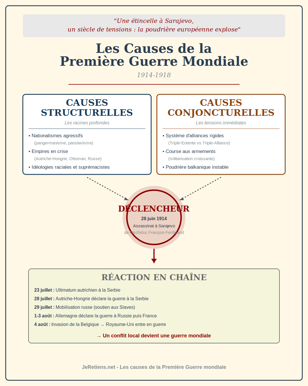 - Causes Conjoncturelles : Alliances militaires rigides (Triple-Entente vs. Triple-Alliance) et course aux armements.
