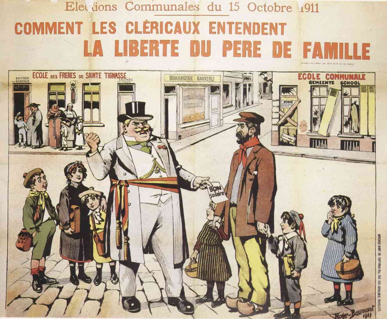 La liberté du choix du père de famille dans l'enseignement, en Belgique en 1911 vu par le dessinateur de presse Royer Baumont.
