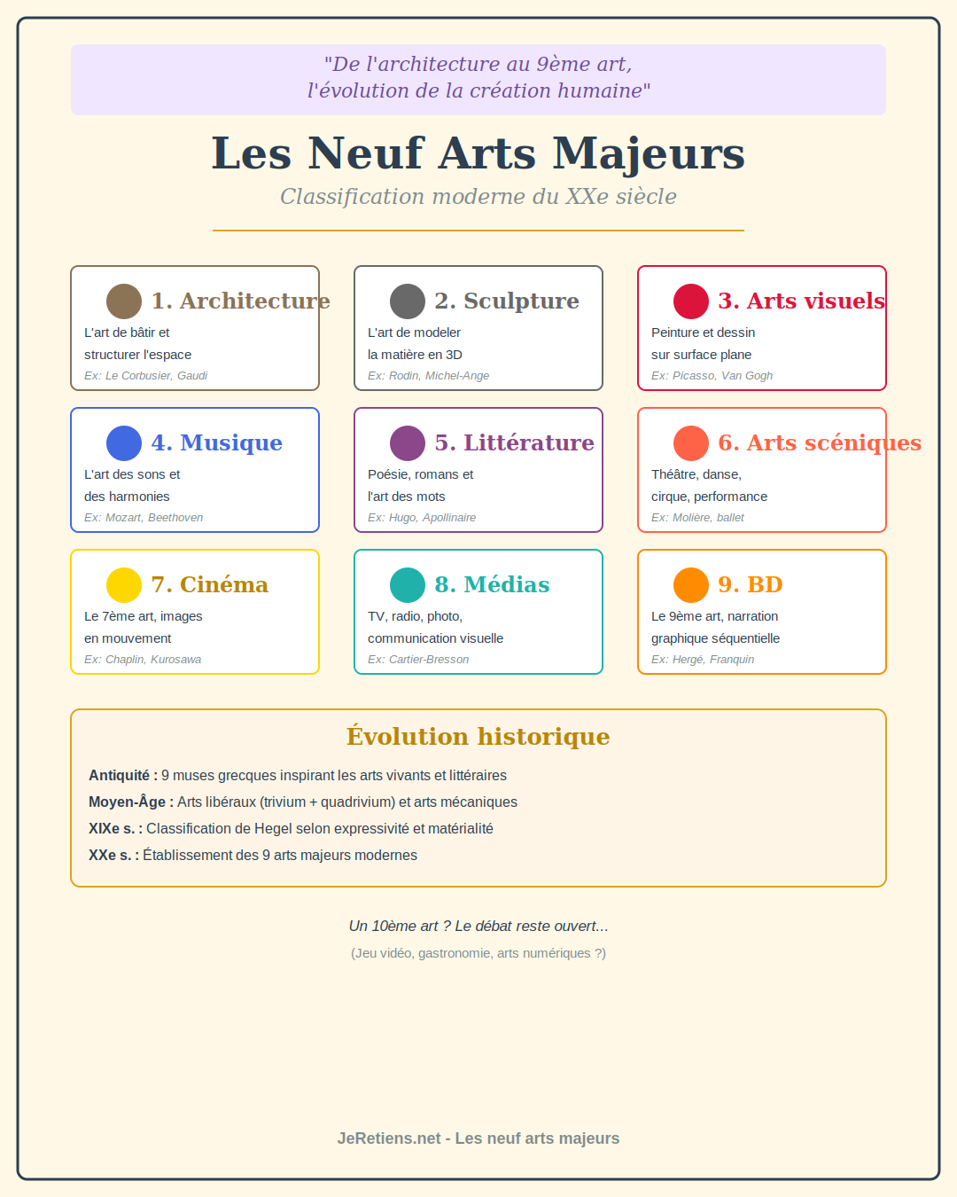 Les neuf arts majeurs sont : 1) l’architecture, 2) la sculpture, 3) la peinture, 4) la musique, 5) la poésie/littérature, 6) les arts de la scène (théâtre, danse), 7) le cinéma, 8) les arts médiatiques (radio, télévision), et 9) la bande dessinée.