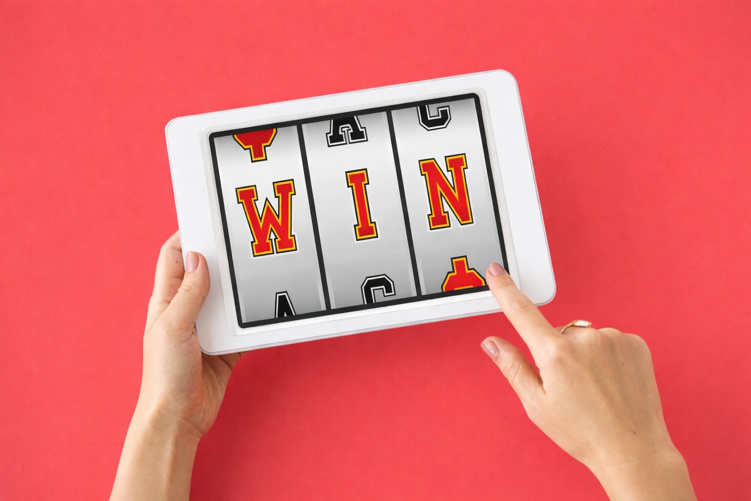 Main utilisant une tablette avec le mot WIN sur un écran de machine à sous numérique